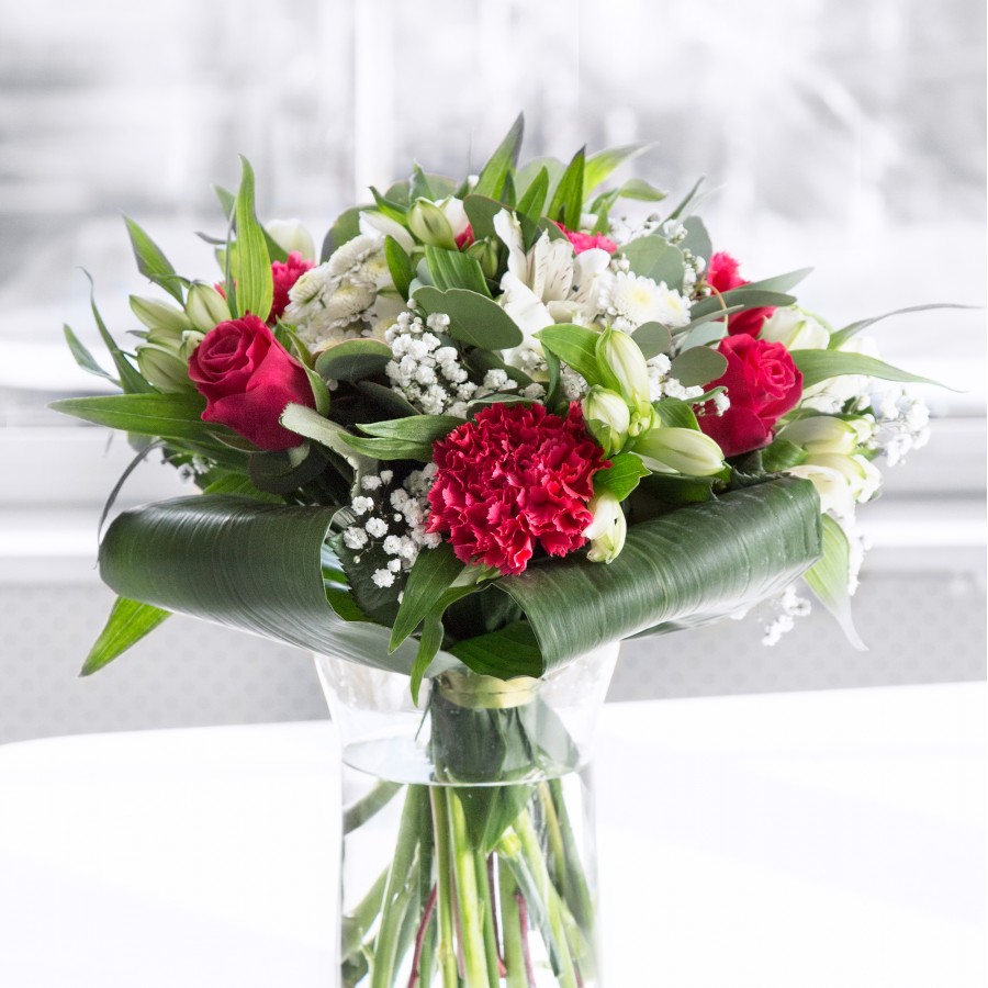 Admire the artistry and uniqueness of our freshly arranged bouquet, designed to inspire and captivate. This stunning arrangement includes vibrant red roses, pure white chrysanthemums, lively carnations, and delicate gypsophila, elegantly combined with white alstroemeria and rich aspidistra leaves.